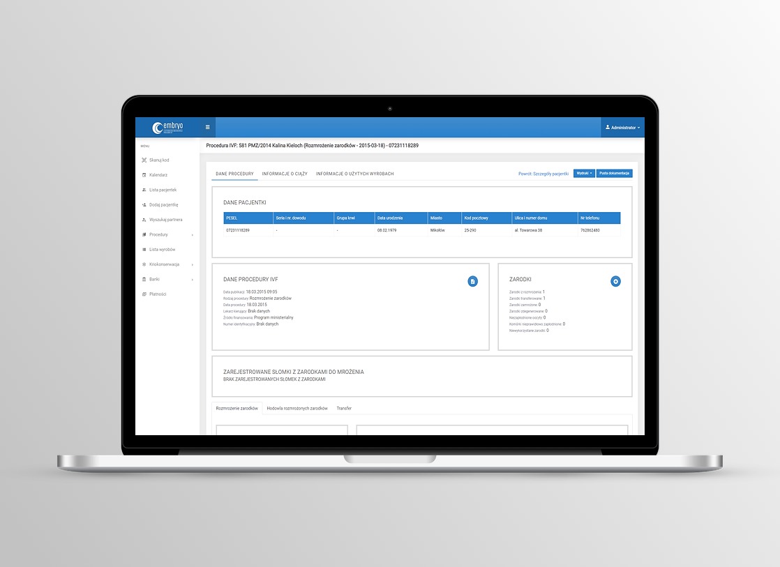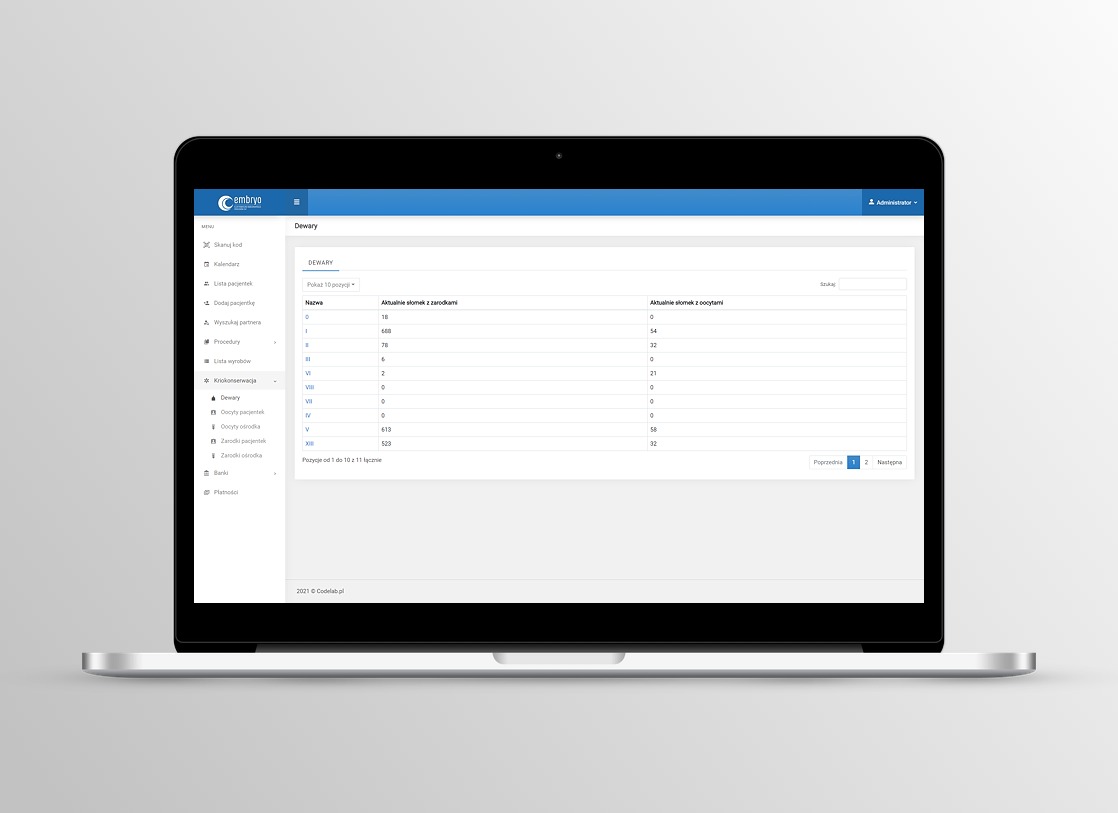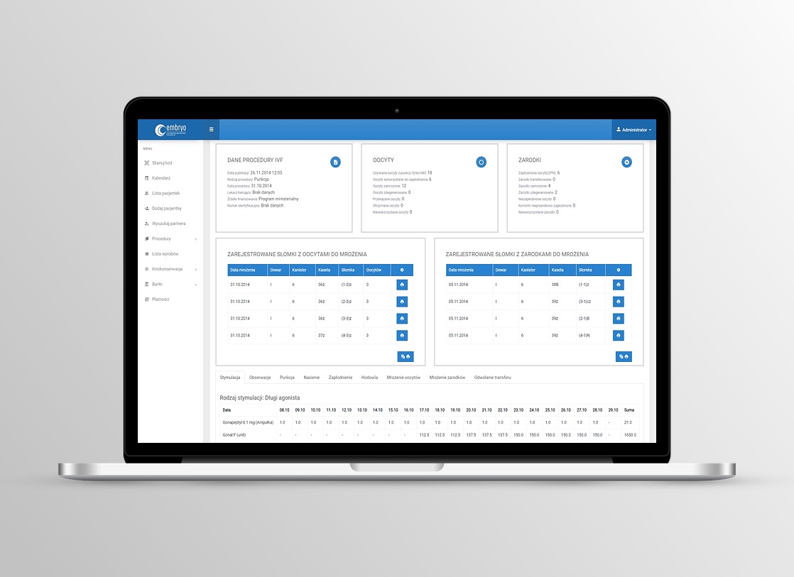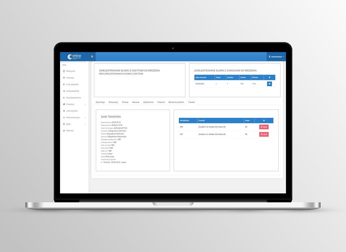 Embryo zapewnia szczegółowe wsparcie dotyczące prowadzenia dokumentacji związanej z procesem mrożenia komórek rozrodczych oraz zarodków. W systemie możliwe jest zarejestrowanie pełnej historii obiektu poddanego kriokonserwacji wraz ze szczegółowymi danymi charakteryzującymi mrożenie - dewar, kasetę czy słomkę. W przypadku procedur andrologicznych Embryo pozwoli opisać lokalizację probówek i wesprze administrację bankiem nasienia.
