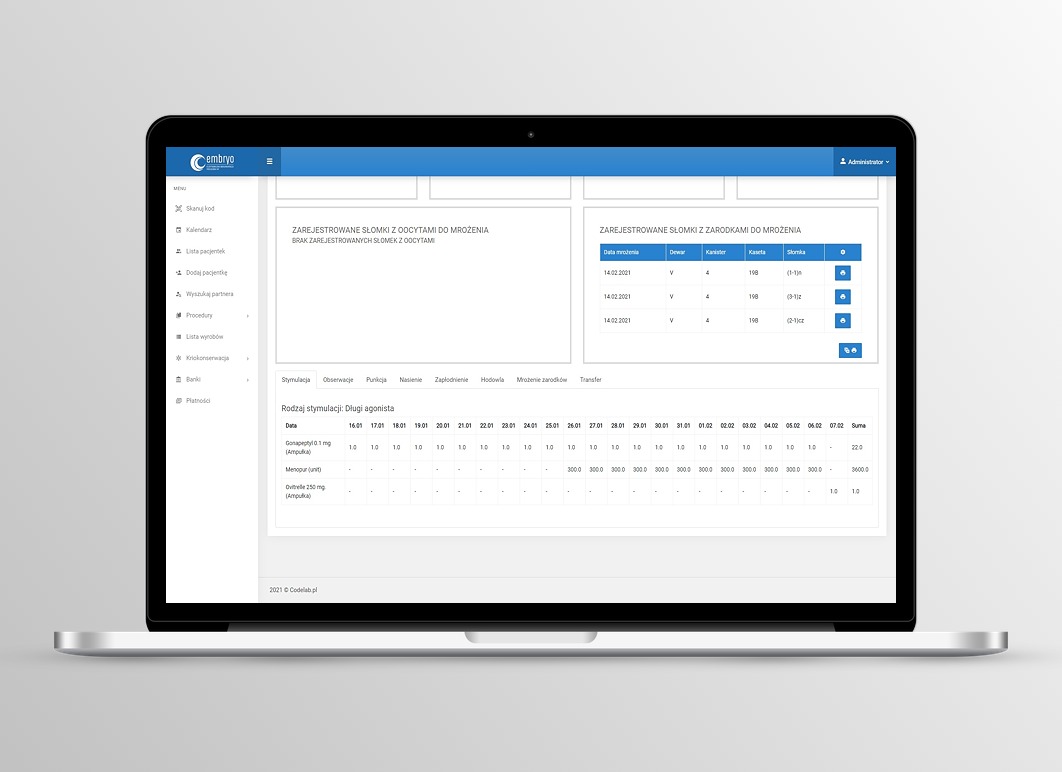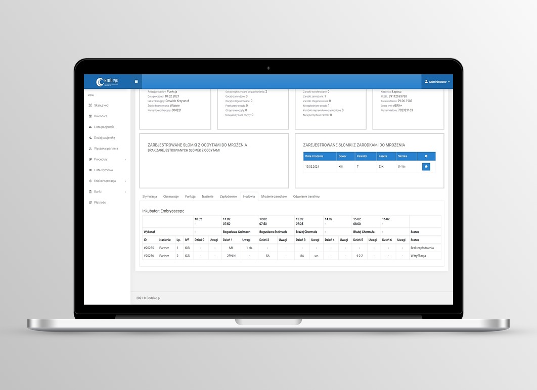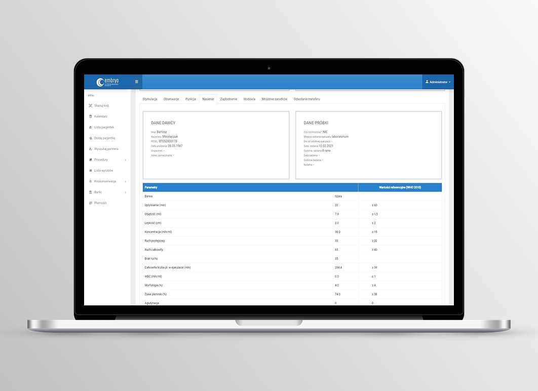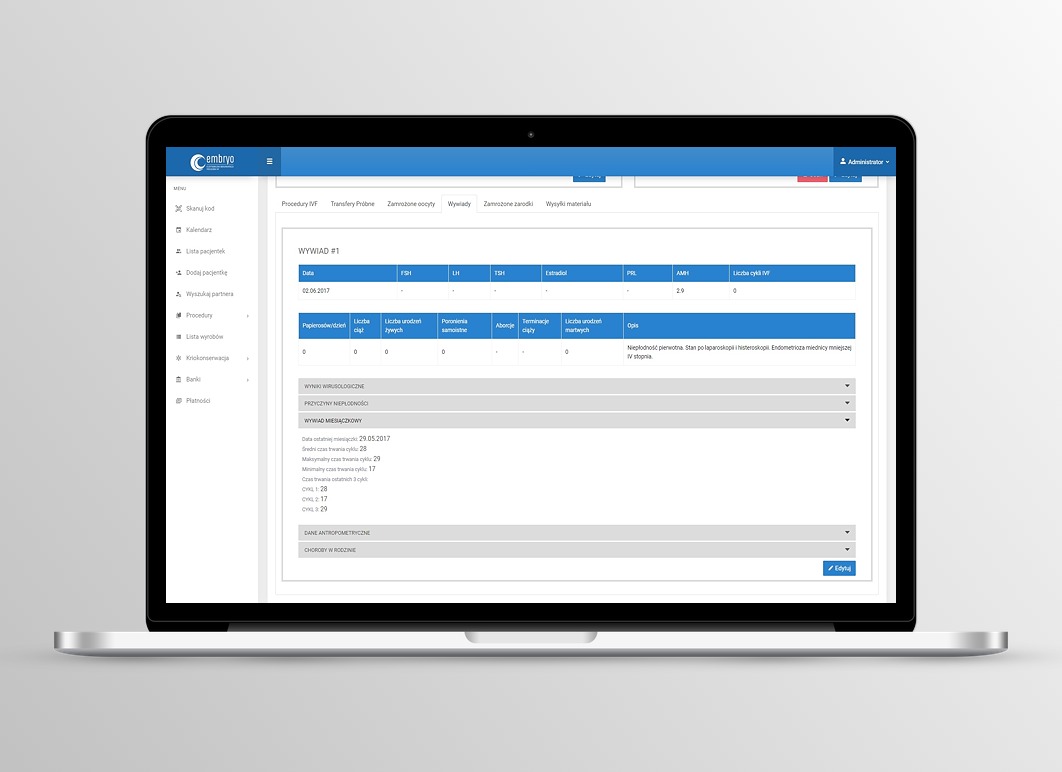 Badania laboratoryjne w trakcie prowadzenia procedur medycznie wspomaganego rozrodu przeprowadzane są na kilku etapach. Już na wstępie wywiadowi medycznemu towarzyszy rejestracja kompletu wyników laboratoryjnych, w tym wirusologicznych i bakteriologicznych. Formularze pozwolą wprowadzić do systemu między innymi dane opisujące poziom hormonu folikulotropowego (FSH), lutropiny (LH), tyreotropiny (TSH) czy estradiolu. W części wirusologiczno-bakteriologicznejj zarejestrujemy między innymi HCV, HBS, HIV, obecność kiły czy poziom immunoglobulin IgM i IgGb.